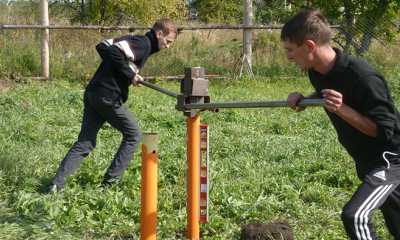 - установка первой сваи. Первой всегда устанавливается угловая свая. Чтобы закрутить винтовую сваю своими руками следует продеть металлический прут в проушины и вдвоем аккуратно закручивать. Длина рычага – 2-3 м. Чем длиннее рычаг, тем меньшее усилие нужно будет прикладывать для закручивания сваи. На ствол крепится уровень, и после каждого витка контролируется степень отклонения. Допустимое отклонение составляет не более 2°.
