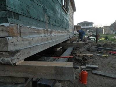 - Первостепенно следует поднять сооружение, которое стоит на фундаменте, при помощи домкратов и зафиксировать его прочными сваями или бревнами.