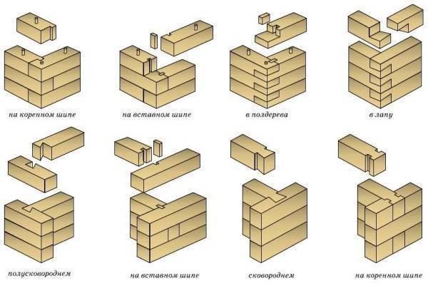 - Сборка стен из бруса. Если не заказан стеновой комплект с готовыми чашами, их «зарезают». Выпиливают по шаблону. Из куска фанеры вычерчивается шаблон, его обводят, потом выпиливают. Чаще используют бензопилу, но требуется довольно высокая степень владения инструментом: от точности выполнения запила зависит насколько теплым будет дом. Формы соединения бруса — на картинке.