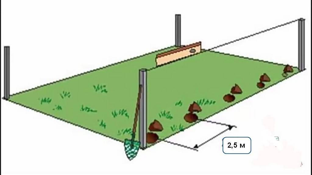 - Подготовка и очищение участка, планирование и разметка. Расстояние между столбами не должно превышать 2,5-3 м, иначе полотно будет провисать или же возникнут другие проблемы.