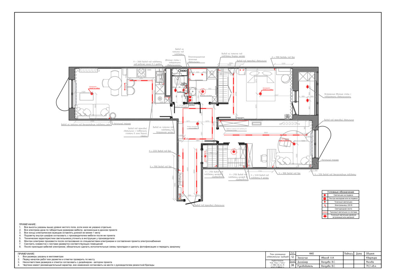 Что делает дизайнер. Указывает на чертеже, как электрика располагается по отношению к мебели. Указывает расстояния до электроточек от углов, проёмов и пола.