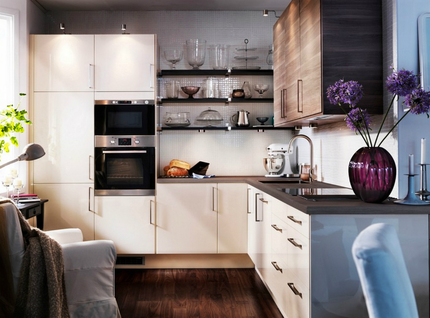 Мебель для кухни должна быть выполнена в спокойных, нейтральных тонах. Идеальным решением считаются глянцевые фасады, которые отражают свет, и иллюзорно увеличивают помещение. Дополнительную воздушность маленькому помещению придадут навесные стеклянные полки, на которых удобно расположиться столовый сервиз или фужеры.