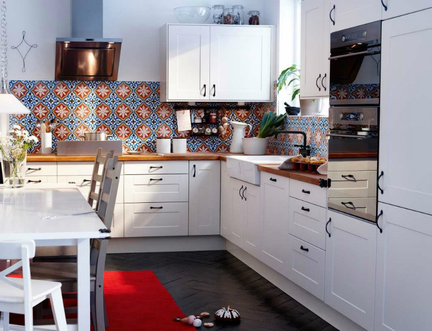 - керамическая плитка часто применяется для напольного покрытия, фартука. С помощью разноцветных элементов легко создать любой узор на поверхности. Для кухни удобна плитка с гладкой структурой, так как шероховатая будет быстро загрязняться и трудно поддаётся очистке;