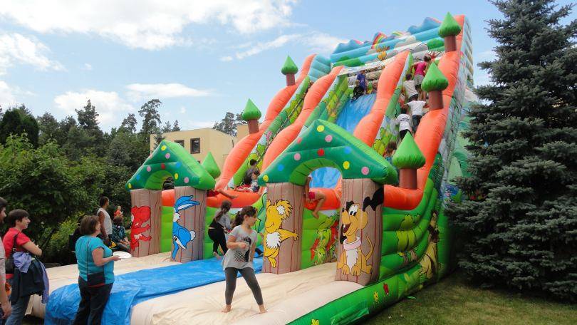 Надувные горки являются модификацией пластиковых и обычно сочетаются с небольшими бассейнами. К ним подключают воду и получают целый аттракцион.