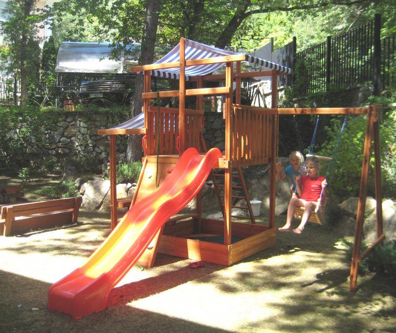 - Любое место установки горки. В отличие от металлической конструкции, деревянный аттракцион можно поставить в любое удобное место на участке, так как в жгучее солнце древесина не нагреется и не обожжёт маленьких непосед.