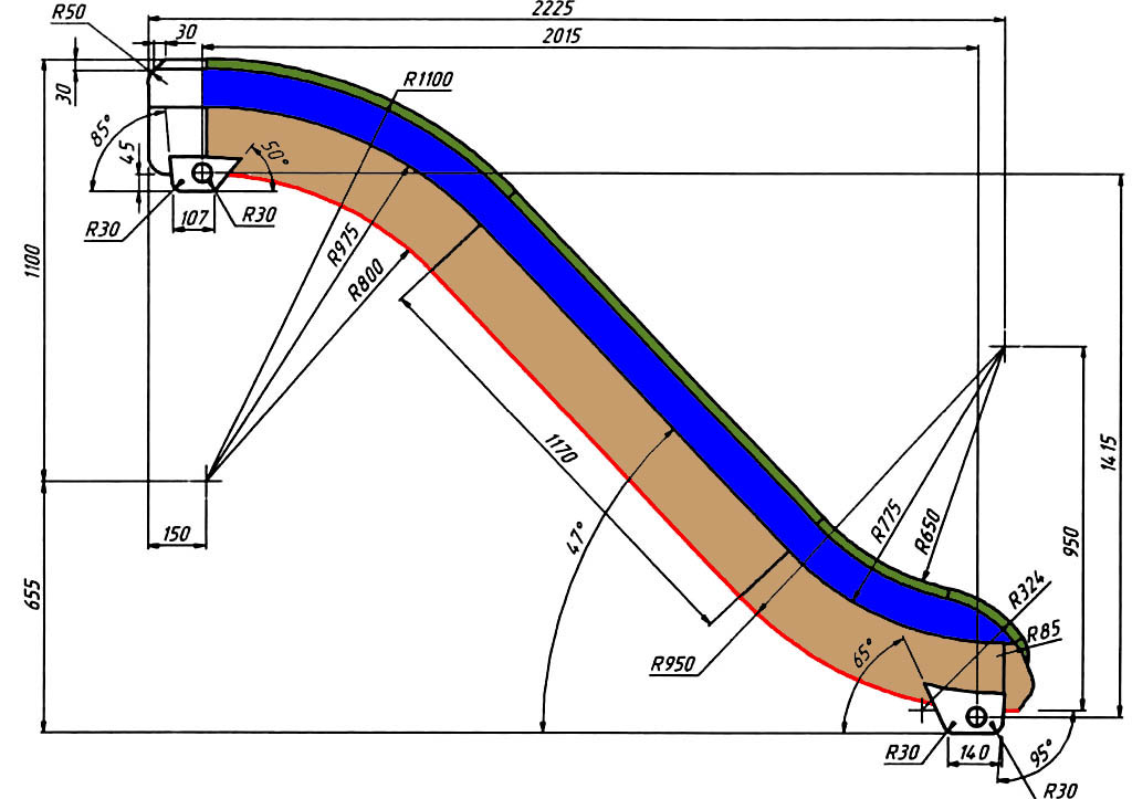 Однако, как сказано выше, пластика на детской площадке лучше избегать. Поэтому для достаточно умелых домашних мастеров даем на рис. слева профиль ската детской горки из листового металла. Красным выделена линия скольжения, коричневым – борта корытообразного желоба, синим – прямой защитный бортик с отгибом наружу; зеленым – упругая накладка на нем из гладкой резины. Последняя необходима, чтобы тормозить руками. Ширина желоба ската — 600-700 мм.