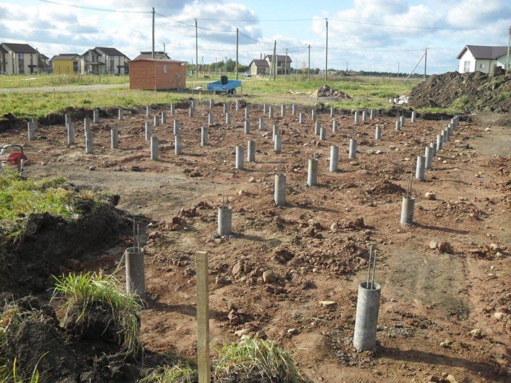 Также желательно устанавливать опоры под тяжелыми элементами (печь, камин, котельная и т.д.). Глубина бурения зависит от того, на какой глубине обнаружены несущие грунты, от уровня промерзания почвы в регионе. Обычно бурят на глубину 1.5-3 метра.