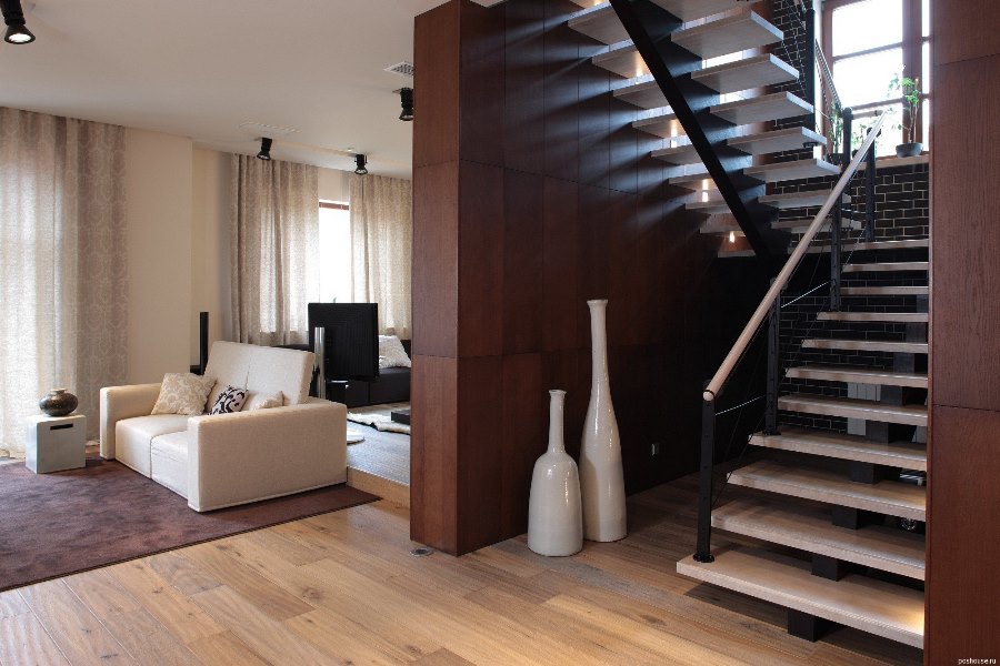 Очень важно правильно подбирать цвета, чтобы они сочетались между собой. Тон здесь задают именно лестничные марши материалом, из которого они сооружены