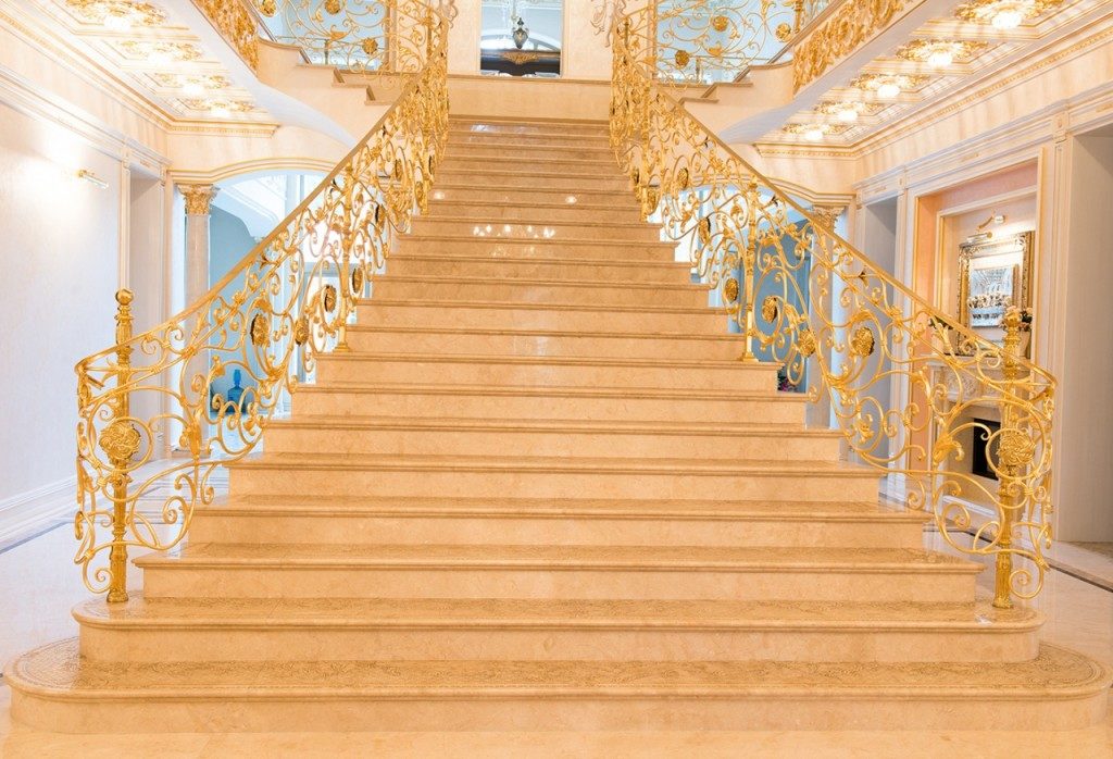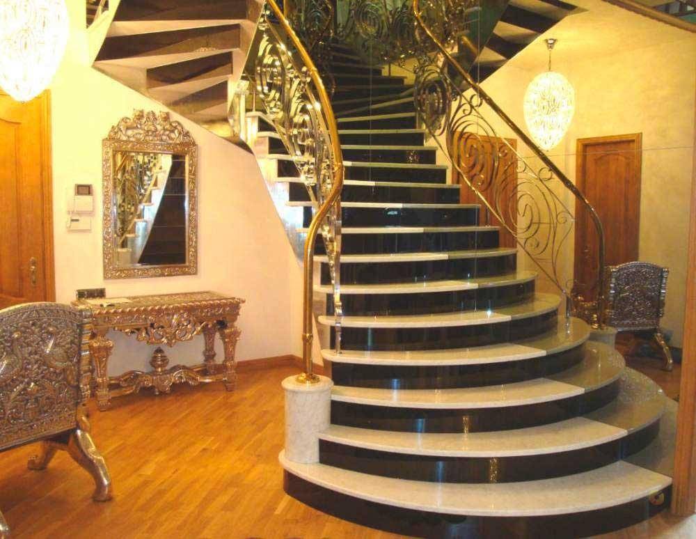 Элитный мрамор заменяют искусственным камнем, натуральный материал через несколько лет начинает постепенно стираться. Лестницы выполняют из железа, алюминия, бронзы и др. Долговечные изделия из металла просто устанавливать, они не требуют больших расходов на ремонт. Делают их из нержавеющей стали с деревянной облицовкой по каркасу. С помощью этого материала несложно воплотить в реальность любую задумку дизайнера.