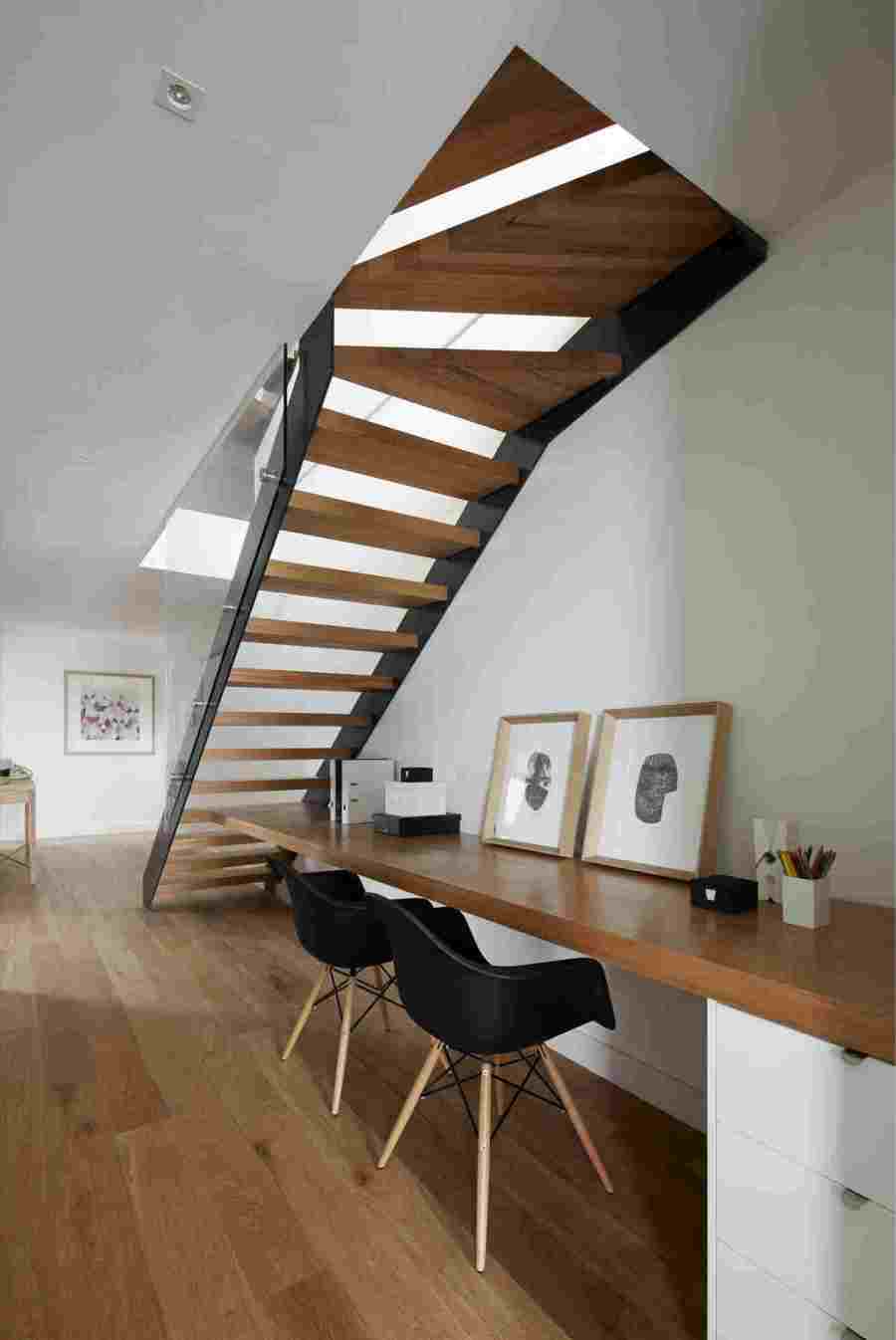 Частый дизайнерский прием — зонирование помещения при помощи лестницы. К примеру, расположив в квартире-студии лестничную конструкцию посередине комнаты, можно разелить кухню и гостиную.