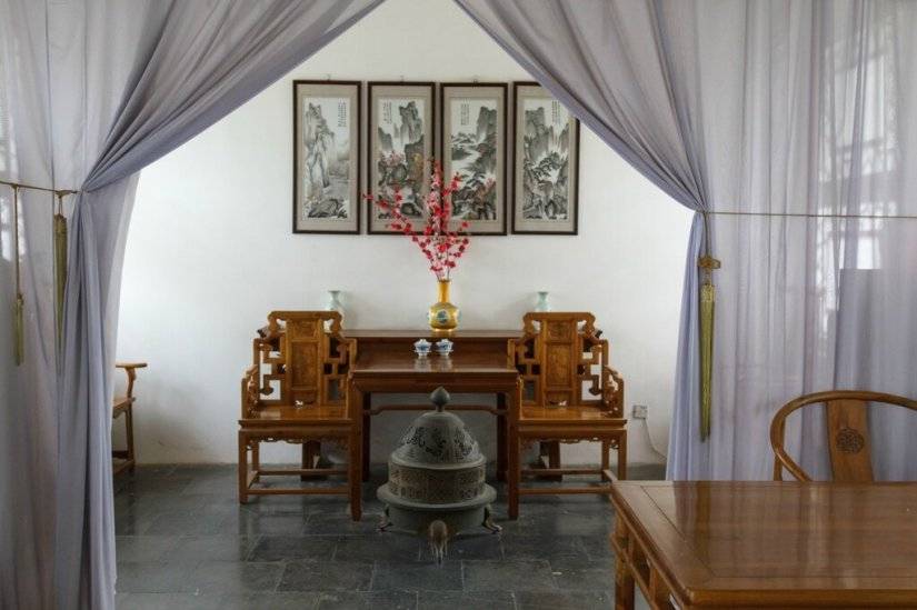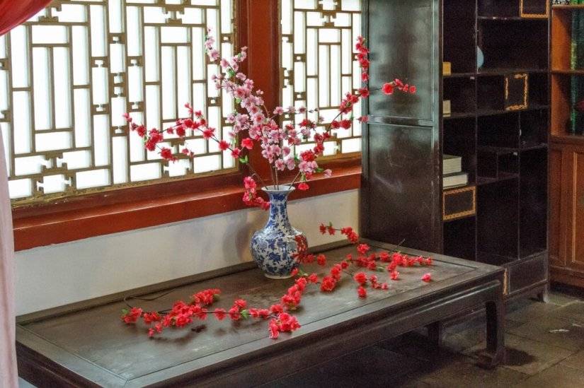 Обилие текстиля и использование оттенков яркой цветовой гаммы делает интерьер наполненным, к выбору мебели нужно подходить очень осторожно, один лишний комод или неудачное место для дивана может нарушить гармонию. Китайский интерьер часто украшают уникальные экземпляры ручной работы, для росписи которых используются иероглифы, орнамент и узоры