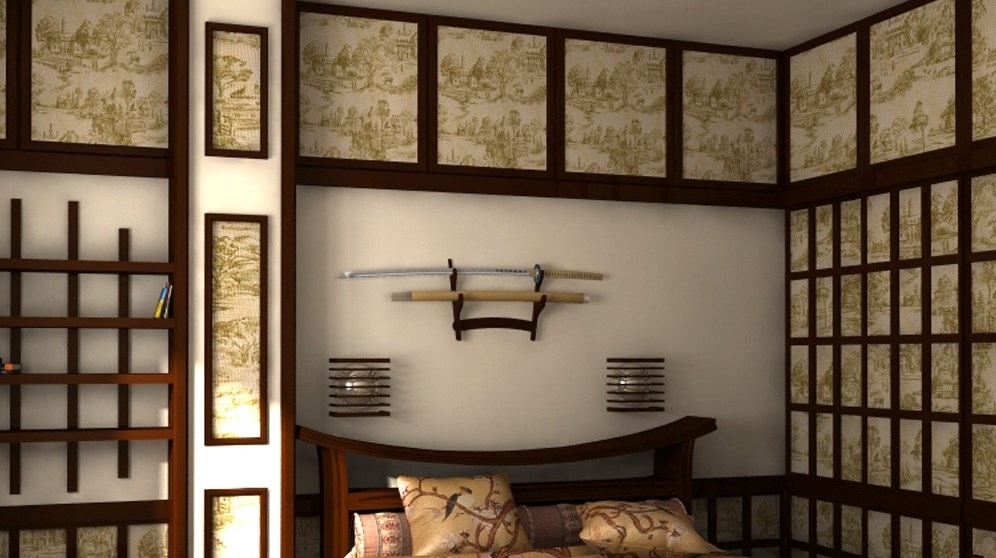 В качестве декоративных элементов могут быть использованы разнообразные статуэтки, веера. Стены и картины украшают рисунки с изображением растений, птиц, китайских иероглифов.
