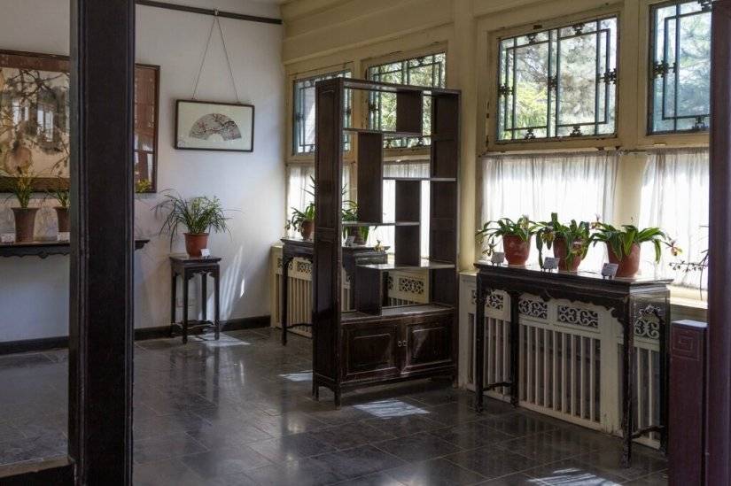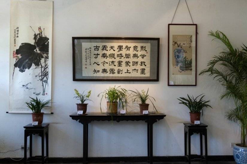 Картины и стол с орхидеями. Один из павильонов в парке Чжуншань, Пекин