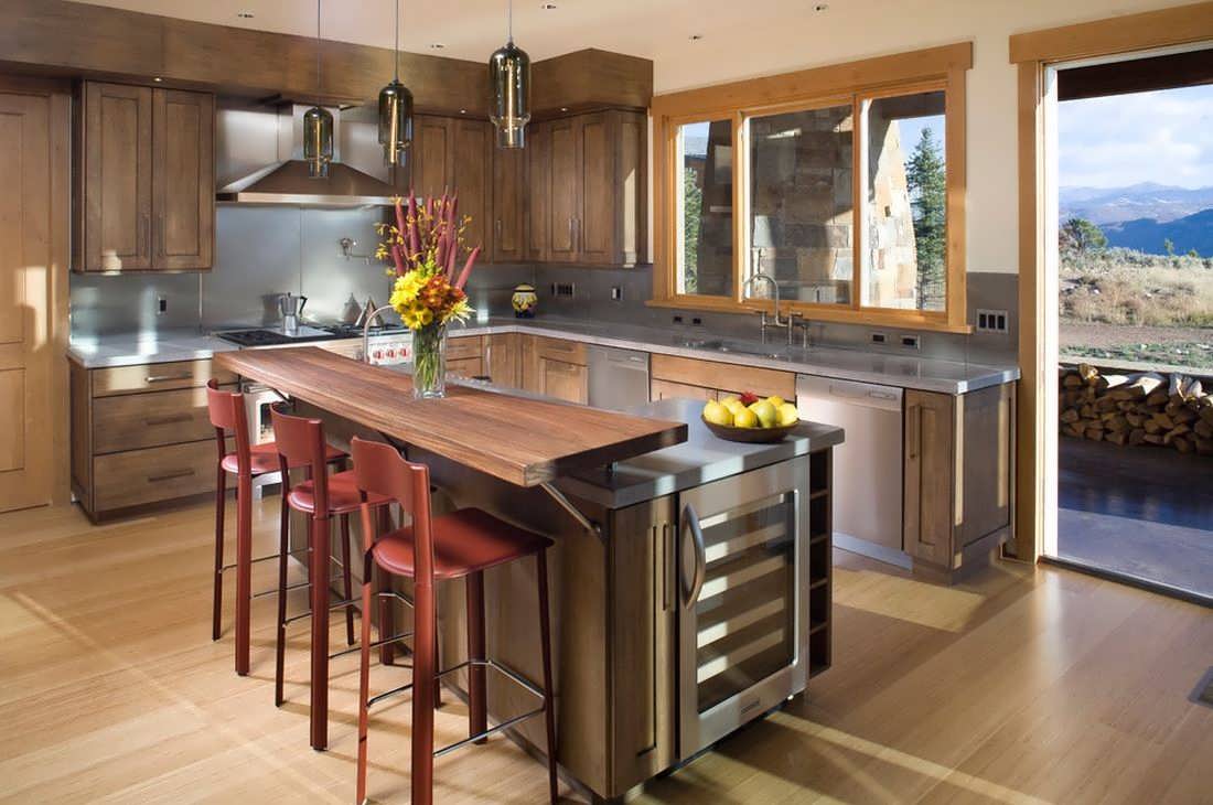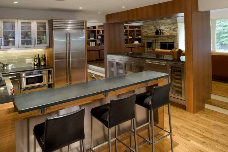 Если нужно разделить на зоны кухню-гостиную, то сделать это можно барной стойкой.