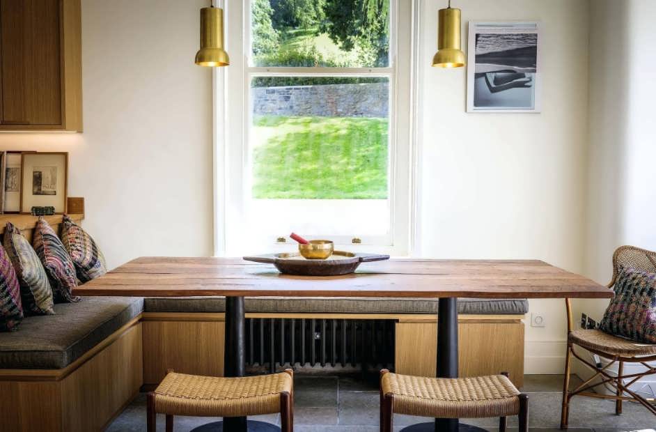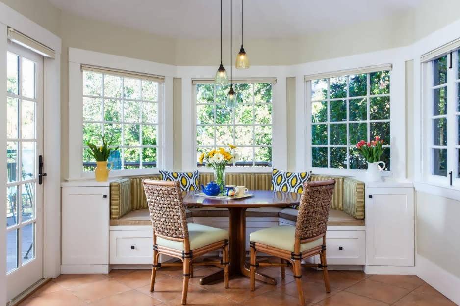 Потрясающе будет смотреться обеденная зона со скамьей. Это также отличное место для экономии пространства, потому как скамейка занимает гораздо меньше места, нежели несколько стульев.