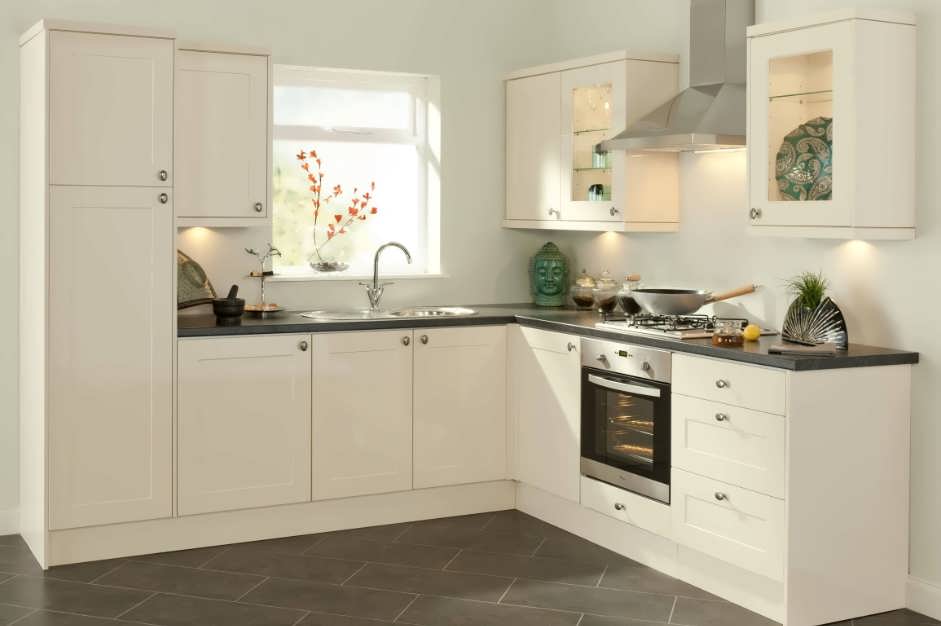 Гарнитуры такой формы оптимальны для небольших помещений. Все навесные элементы будут на глухой стене.