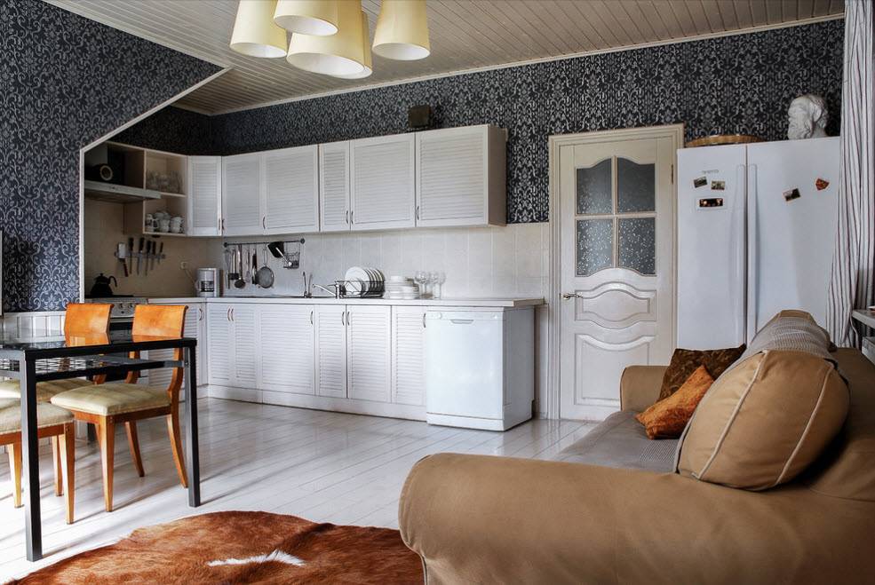 Также можно поставить холодильник в комнате и даже сделать там обеденную зону. А чтобы отделить жилую зону комнаты от обеденной – можно соорудить зонирующую перегородку (из гипсокартона, занавески, стеллажа и т.д.).