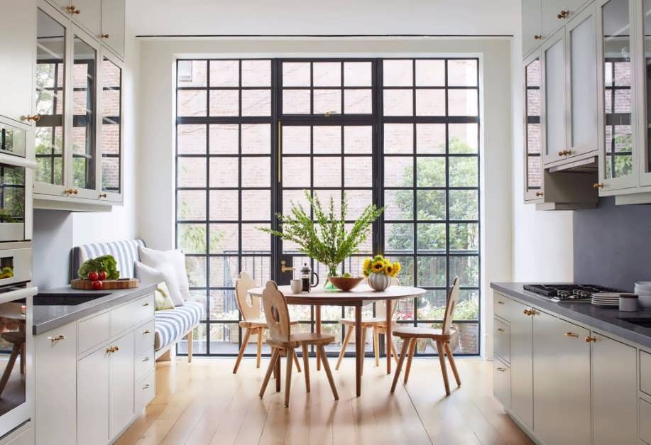 Размещение оконного проема в обеденном пространстве – это оптимальный вариант для кухни, где преобладает не рабочая зона, а столовая.