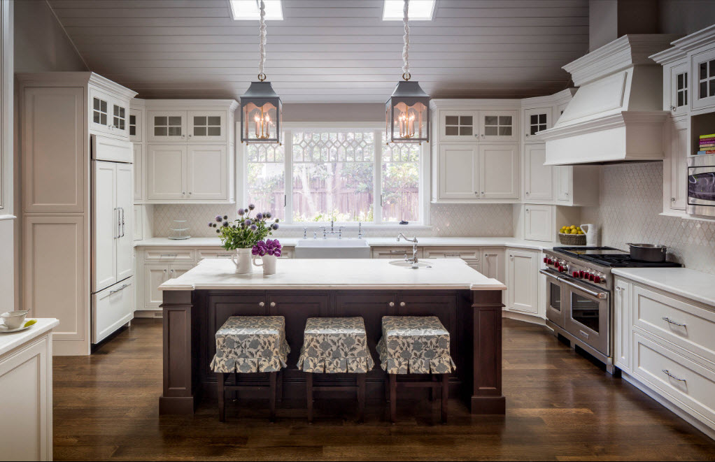 Кухня в доме может быть такой же современной, как и в городской квартире. Комфортная белая мебель, рабочая зона из плитки, вытяжка поверх печки – все это прекрасно комплектуется на кухне в частном доме.
