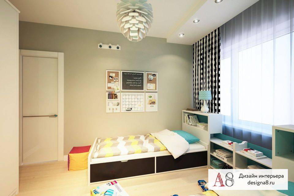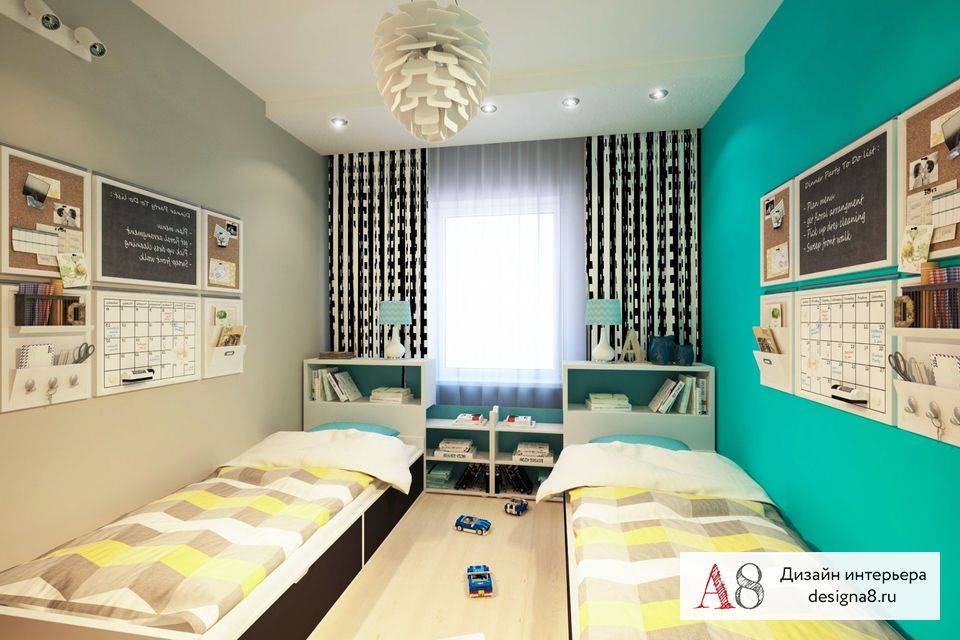Напротив входа поставили отдельно стоящий шкаф. В дальнейшем, когда дети подрастут, его можно поменять на более функциональную мебель.