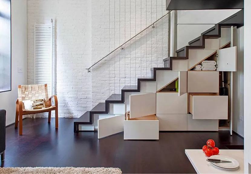Лестница – не просто способ подняться на второй этаж. Под ступеньками можно расположить тумбы. Это поможет не только не заставлять дом лишней мебелью, но и избавиться от пустого пространства под лестницей. Чем больше в доме свободного места – тем уютнее в нём будет жить. Если использовать подобные места для хранения вещей, можно полностью избавиться от риска возникновения «давления» стен.