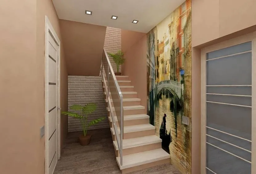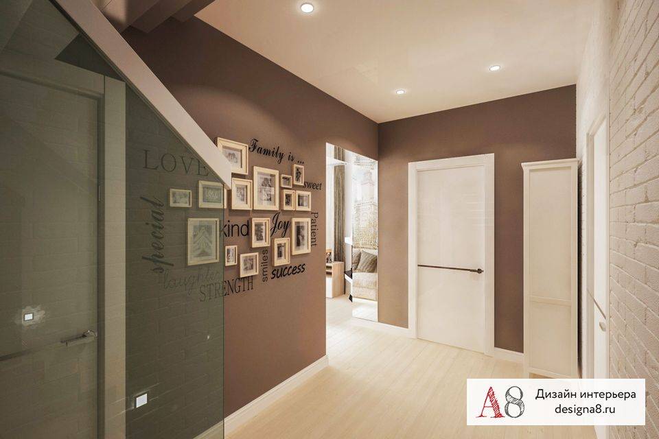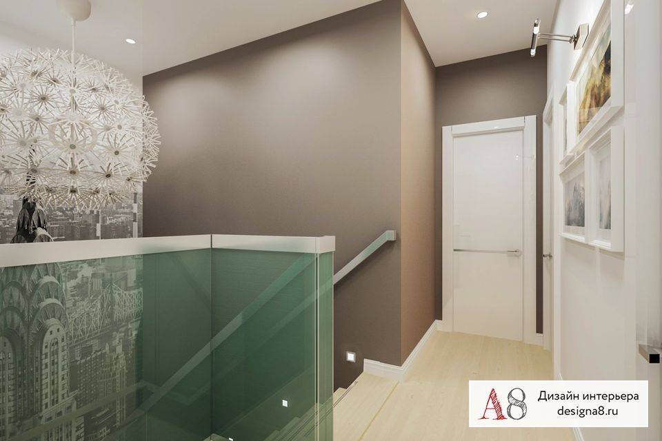 На втором этаже лестница упирается в коридор с бело-бежевой стеной. Поверхность декорировали композициями из картин. Над ними запланировали бра. Это ночное дежурное освещение.