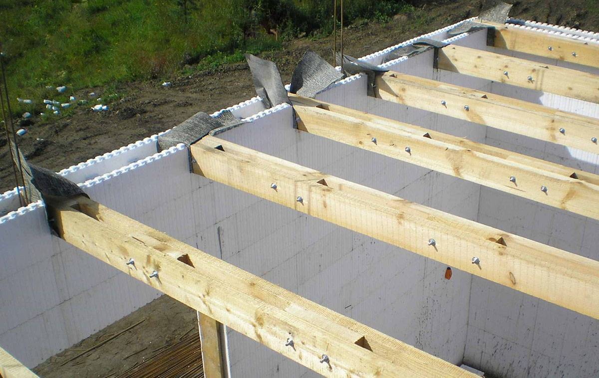Чтобы избежать добавочной нагрузки на основу, дом из пенобетона лучше перекрыть деревянным материалом (кругляком, брусом). Окончания балок, находящиеся на бетонном поясе, следует обернуть рубероидом.