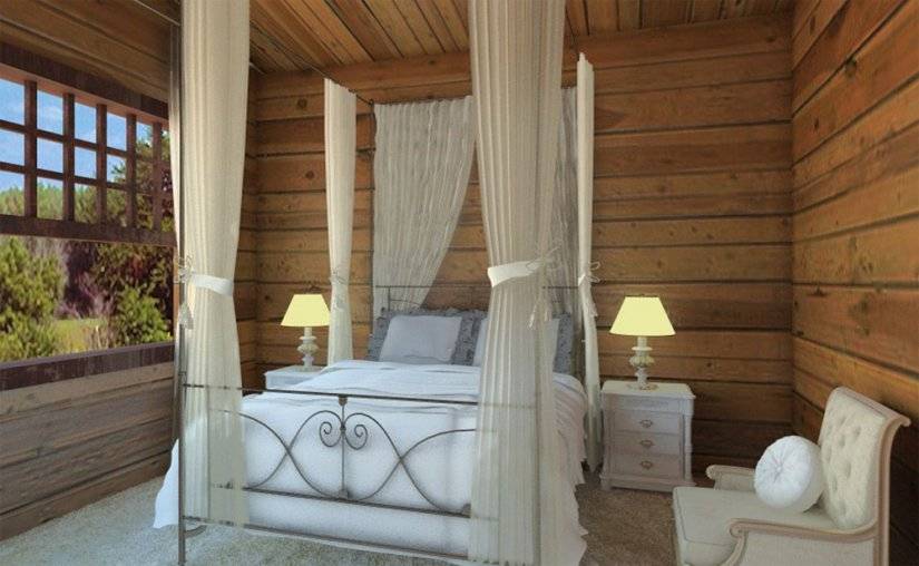 Что касается того, каким должен быть интерьер спальни внутри деревянного дома, то она непременно представляется уютной и камерной. В этой комнате все должно настраивать на расслабление. Как правило, в доме из бруса эти комнаты декорируют в светлых пастельных оттенках. И только детали помогают расставить пару цветовых акцентов. Здесь могут преобладать выбеленный сруб и контрастно-темная мебель.