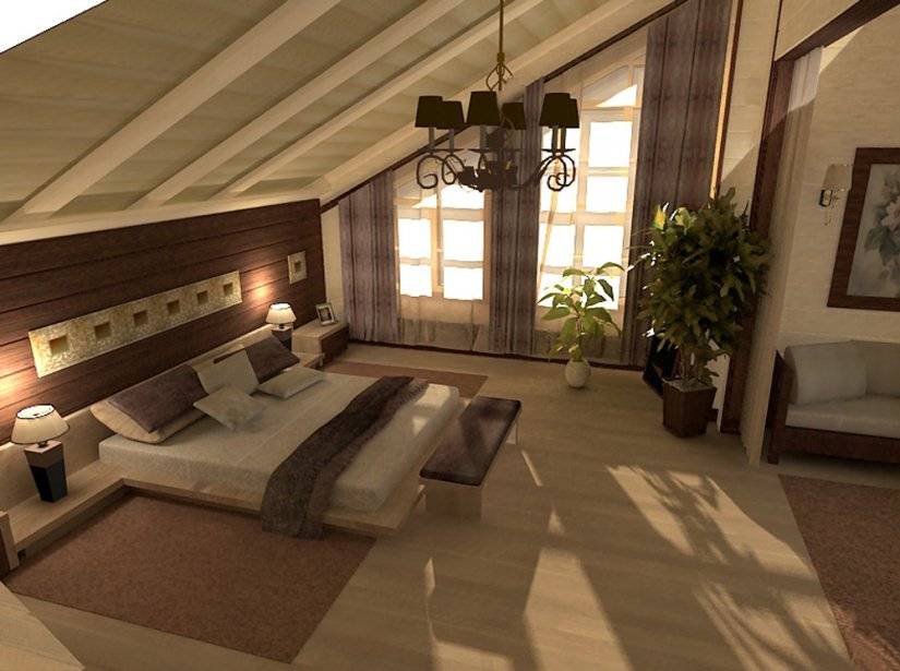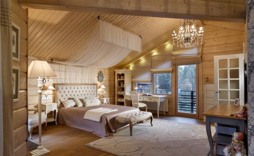 Очень выразительно выглядит интерьер, где потолок спальни в деревянном доме изукрашен узором, художественной росписью. Органично смотрятся потолочные балки и даже балки с каркасом в спальнях на втором этаже, оборудованным из крыши.