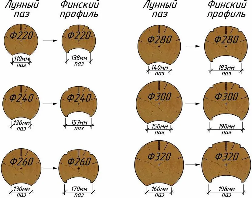 ширина паза. При равном диаметре бревна (например, 220 мм), финский паз будет шире (140 мм) лунного (110 мм). Также бывает расширенный лунный паз (на 20 мм шире).