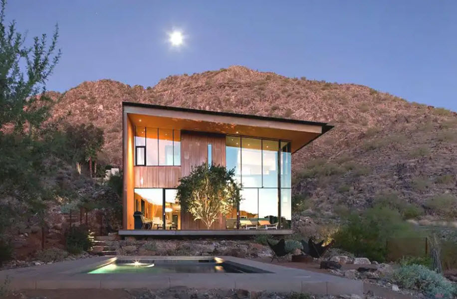Проект одноэтажного дома разработан крайне творческими людьми, поистине исключителен. Сочетая светлые и темные материалы, архитекторы подчеркивали контраст между современными и традиционными темными стилями. Это также было сделано, чтобы вставить дом в скалистую среду. Результат неожиданный и довольно интригующий, учитывая его размер.