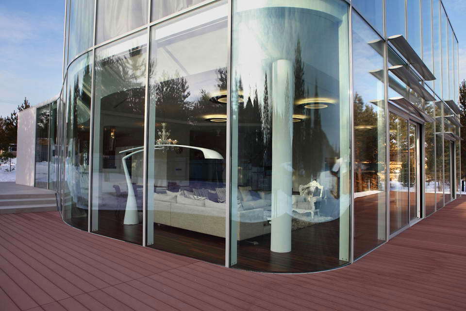 Фасад частного дома из стекла. До недавнего времени о таком можно было только мечтать. Выполнение таких проектов в России казалось чем-то из области фантастики из — сурового климата на большей части территории страны. На первый взгляд это не вяжется с применением ограждающих конструкций из стекла и металла. Это не так. Рассмотрим варианты использования стекла для устройства светопрозрачных фасадов для коттеджей и небольших частных строений.