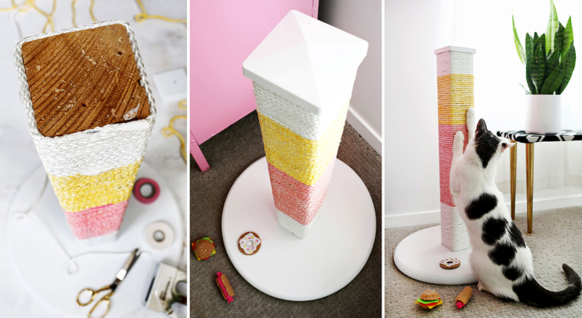 Когтеточка для кошек своими руками в виде столбика является ещё одним несложным вариантом. Представляет собой небольшую подставку, на которой закреплён брус, конус или цилиндр, плотно обтянутый джутом. Сверху может быть площадка для отдыха, но и без неё конструкция добросовестно справится с возложенными на неё обязанностями. Довольно часто на верхушке столбика закрепляют разные игрушки, поэтому кошка может не только поточить коготки, но и порезвиться.