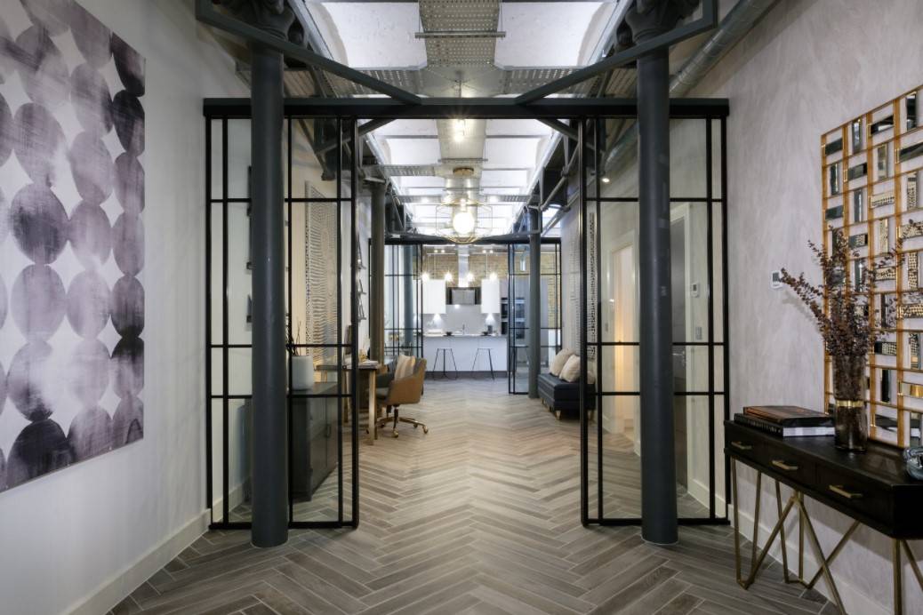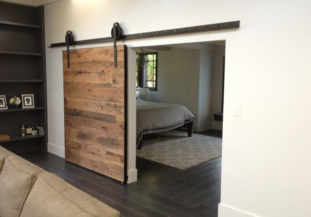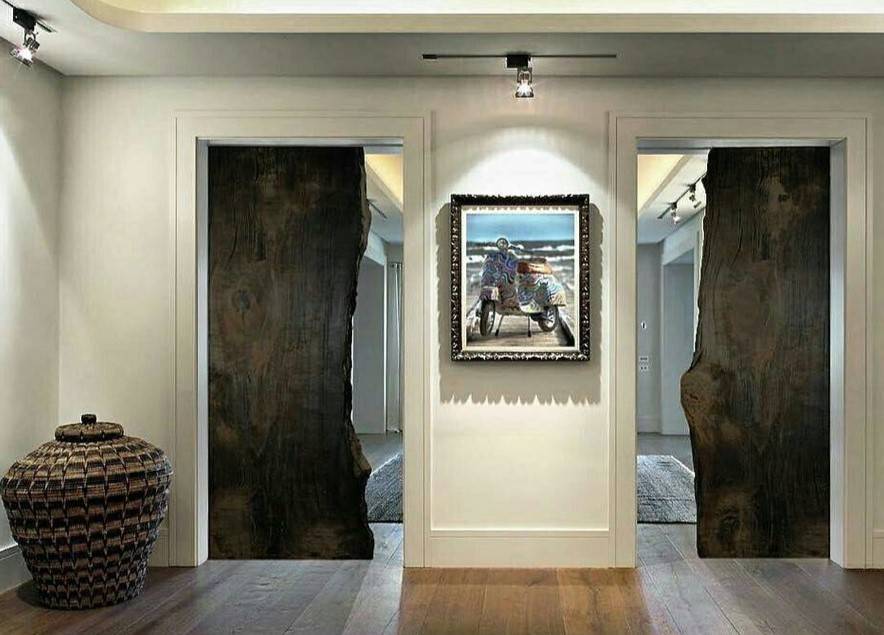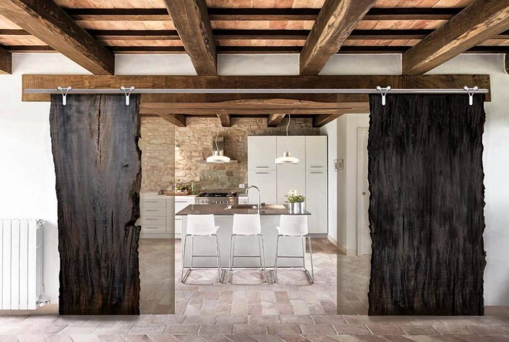 Грубая деревянная дверь — это тренд, родом из Техаса. Если раньше это была обычная необходимость для хозяйственных построек, то теперь полотно из дерева с кованным механизмом считается настоящим эклектичным шиком. Это идеальный вариант при обустройстве пространства в стиле лофт. Также допускается использование для стиля прованс или сканди.