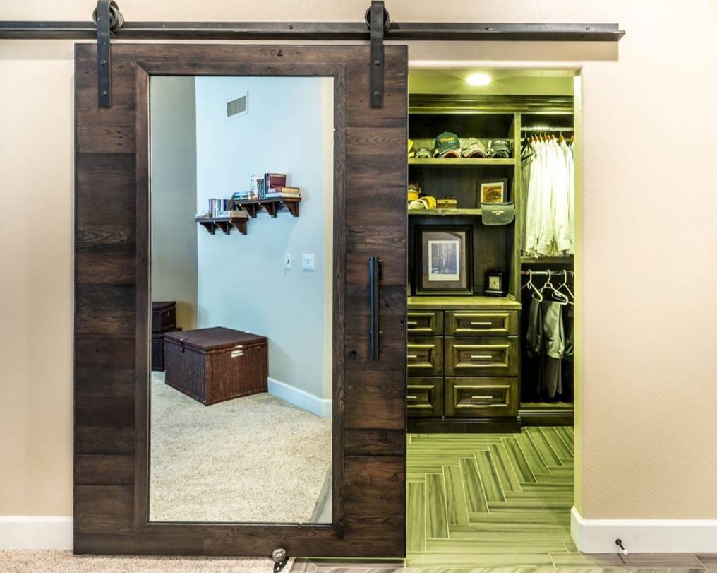 В качестве двери используется полукругла конструкция, передвигающееся по рельсам полукруглой формы. Таким способом можно выделить отдельную комнату в углу помещения с большой площадью. Отличный вариант — обустройство небольшой гардеробной в одном из углов просторной спальни.