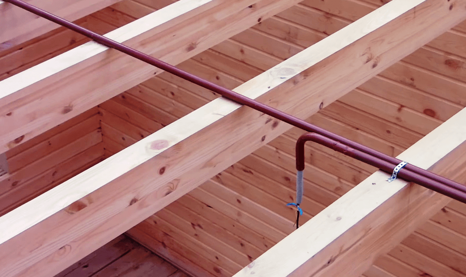Скрытая электропроводка в деревянном доме более эффективна, поскольку делает помещение более приглядным. В то же время, нужно помнить о правилах безопасности дома. Провода обычно скрывают в гофротрубе и располагают за каркасом подвесных или подшивных потолков.