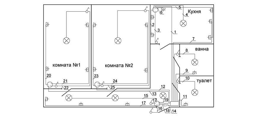 - Электрическую цепь санузла разветвляют с учетом числа помещений.