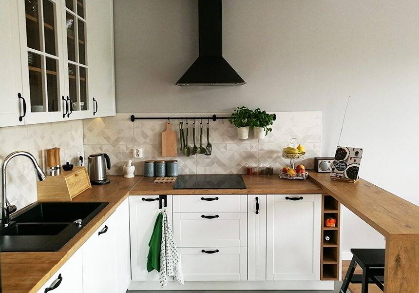 Эргономика L-образной кухни будет еще лучше, если вы будете использовать интересные решения. Одним из них является угловой шкаф с системой вращающихся полок. Благодаря им хранение кухонных принадлежностей станет намного проще.