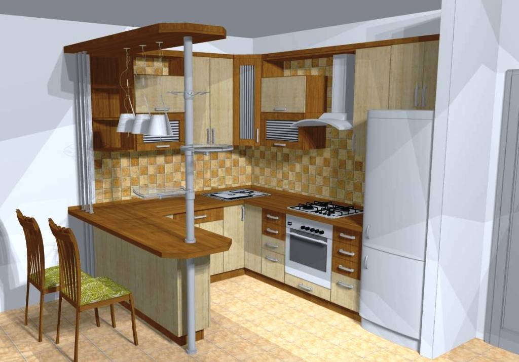При остеклении и основательном утеплении лоджии или балкона очень легко расширить помещение кухни путём присоединения к ней их пространства. При этом нет необходимости демонтировать наружную стену. Достаточно лишь вынуть оконный профиль, а оставшуюся часть стены использовать в качестве дополнительной столешницы или барной стойки. Таким образом, пространство бывшего балкона будет выполнять функции столовой. Такой дизайн маленькой кухни позволяет увеличить площадь помещения на 3 квадрата.