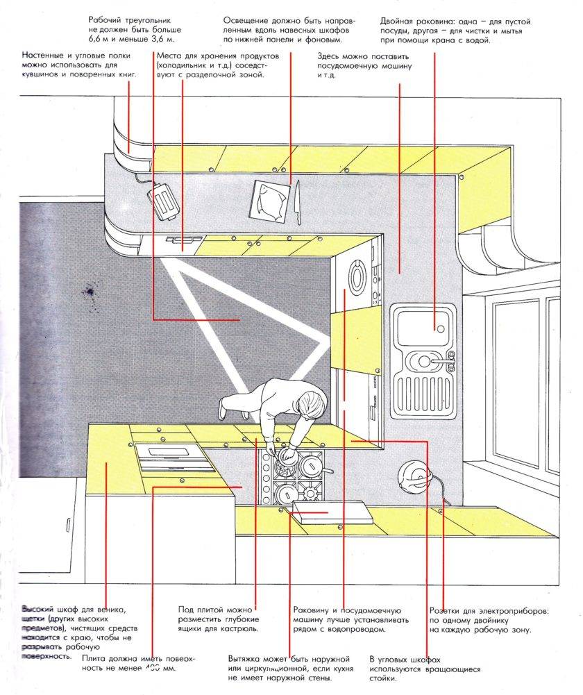 Кухня является мастерской домохозяйки и должна быть обустроена эргономически (эргономика — учет пропорций и размеров человеческого тела), то есть в соответствии с рутинными действиями, выполняемыми ежедневно на кухне.