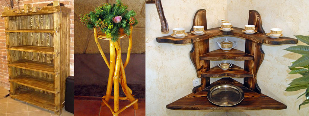 При использовании пиломатериала и стремлении сделать этажерку «под старину», могут быть использованы несколько способов обработки, это: