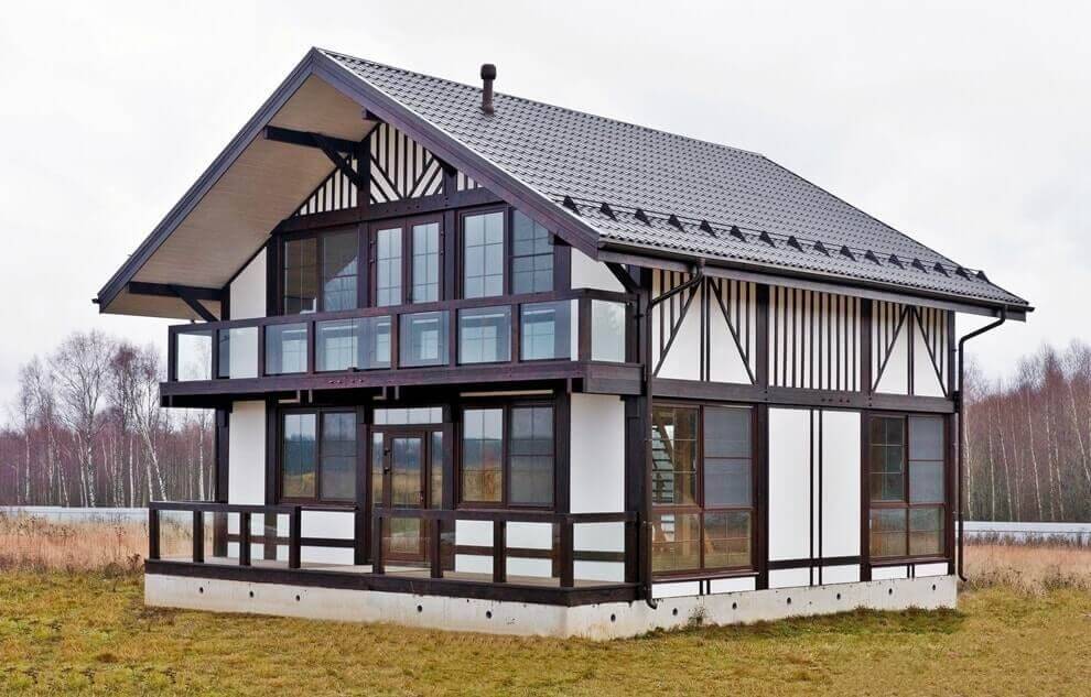На данный момент необычайно популярны фахверковые дома с панорамными окнами.