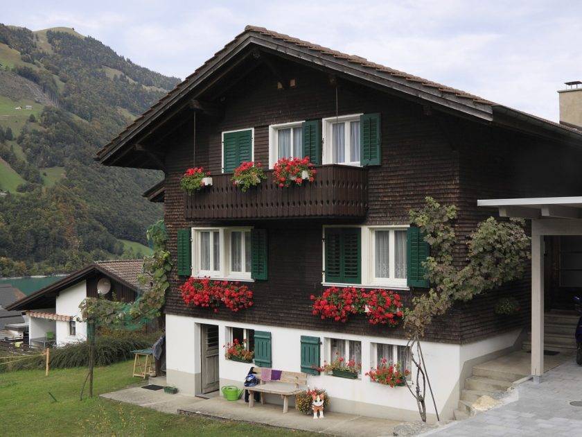 Стиль фасада частного дома характеризуется штукатуркой стен, совмещенной с деревянными элементами. В некоторых домах этого стиля используется лепнина, камень для стен.