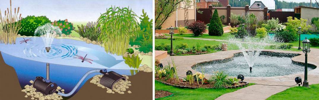 По принципу работы агрегаты делятся на поверхностные и погружные. Погружной насос устанавливают прямо в чаше, где он забирает воду и через фильтр подает к форсунке. Подобный агрегат характеризуется простотой монтажа и небольшими размерами. Его закрепляют на небольшом возвышении в центре водоемчика, чтобы не захватывал отложения на дне.