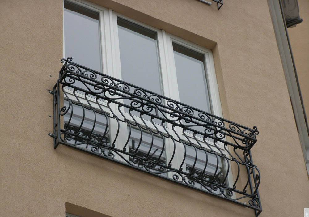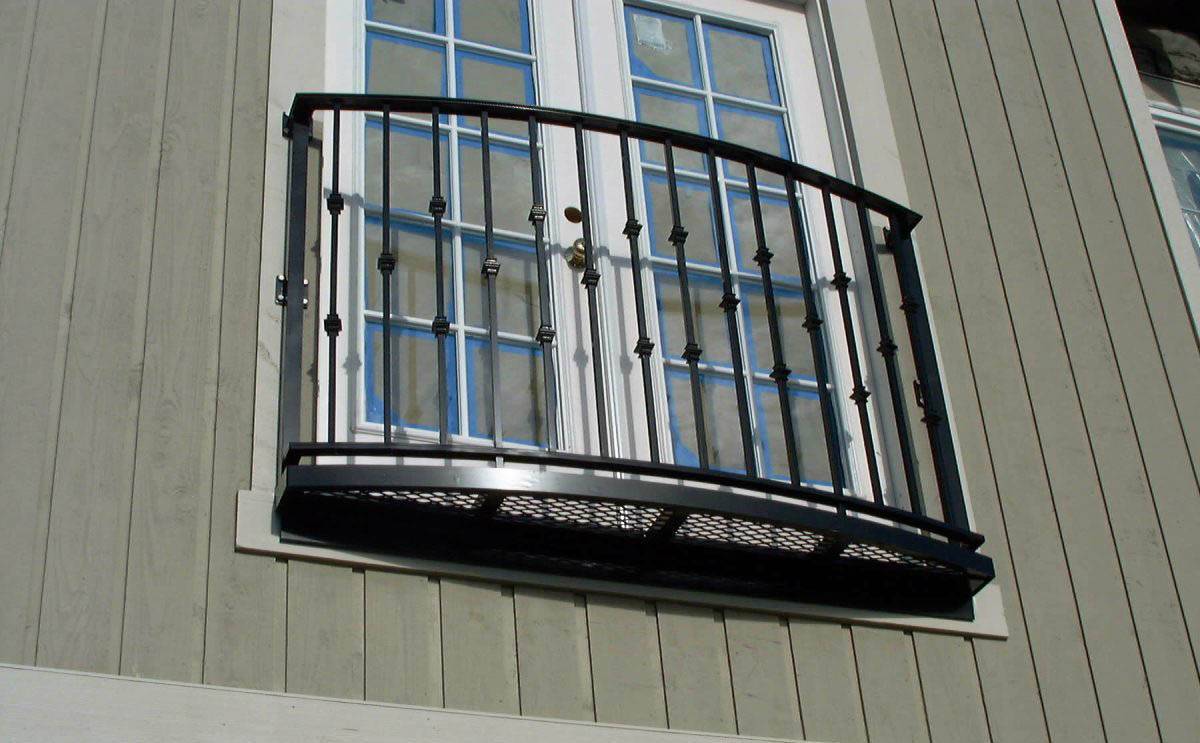 Кованый французский балкон с выступом обладает узкой площадкой, ширина которой чуть больше длины ступни. Такое компактное основание позволяет “выйти на балкон”.
