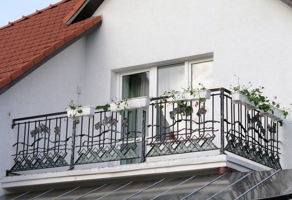 Кованый парапет можно дополнительно украсить подвесными ящиками или горшками для цветов: помимо эстетической функции, буйная растительность будет выступать еще и в качестве дополнительного фактора приватности, закрывая вход на балкон от любопытных взглядов снизу.
