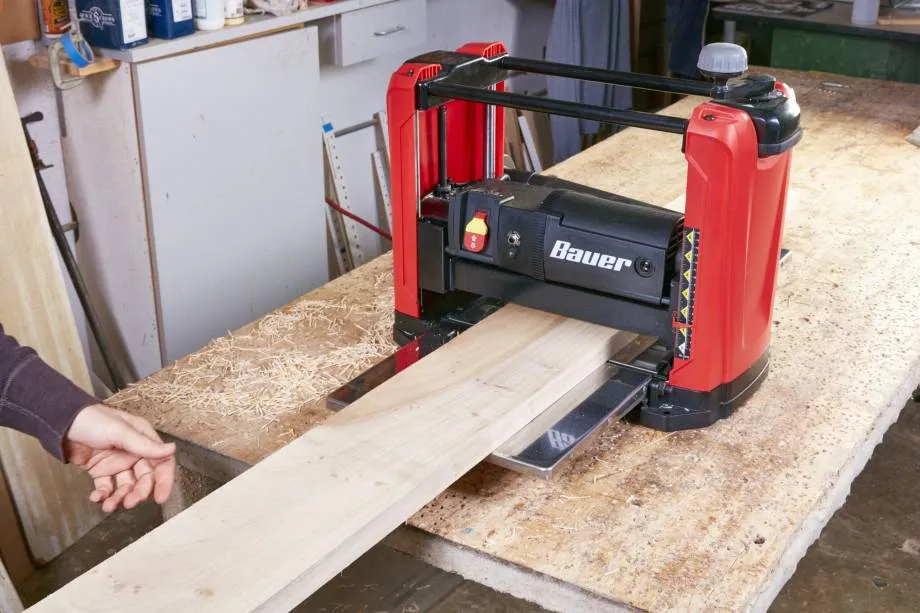 Легкий рейсмусовый станок по дереву для домашней мастерской с двигателем 1,6 кВт, работающим от бытовой электросети 220 В. Несмотря на небольшую мощность, электромотор вращает строгальный вал с высокой скоростью 9000 об/мин. Доска протягивается со скоростью 5 м/мин, что обеспечивает высокую производительность. Размер портала позволяет работать с доской, шириной 31,8 см и толщиной 15 см.