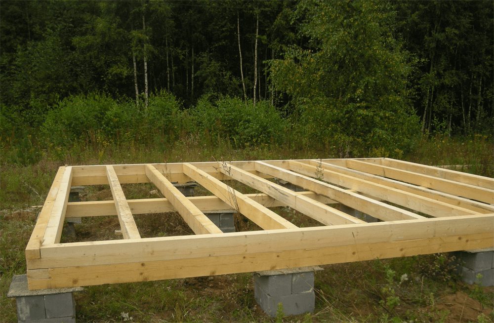 - Сборка и монтаж нижней обвязки балочного перекрытия – основание для будущего легкого строения вполне рационально сделать из балок сечением 100х100, 100х150 или 150х150. Собирают конструкцию начиная с основной рамки, располагаемой по периметру здания. Затем крепят и остальные промежуточные соединения. Деревянные балки таких сечений можно закрепить между собой на кронштейны саморезами или болтами, а также на анкера к самим столбам.