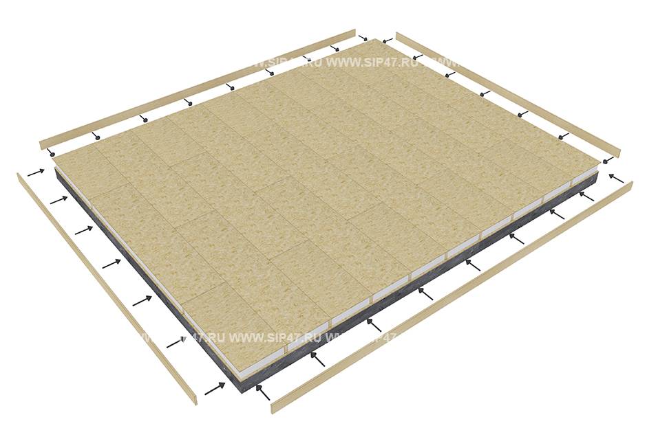 Лаги устанавливаются в пазы, имеющиеся в каждой СИП-панели по периметру.