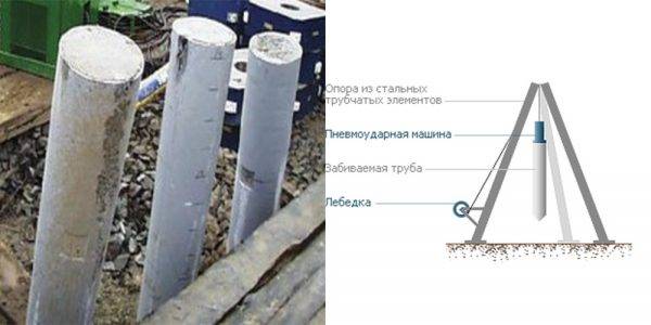 | Металл | Труба с острием и оголовком. | Чаще используется в частном строительстве. Сталь более технологична, чем бетон и гораздо надежнее дерева. Могут быть забиты в грунт при помощи ручного молота. |